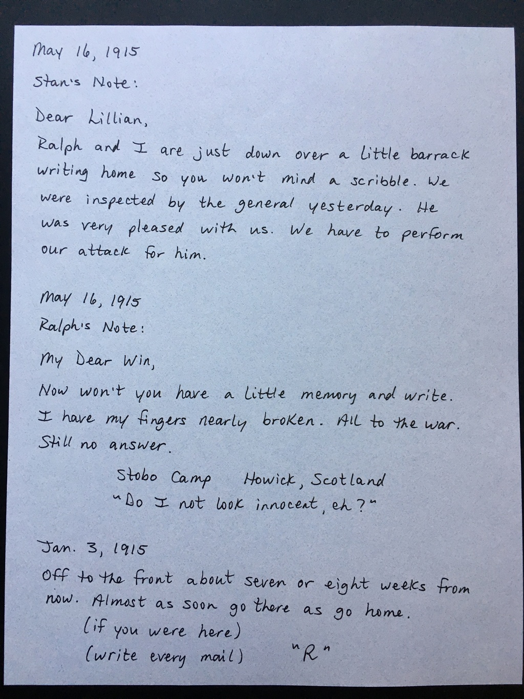 Letters from Stan and Ralph home to their sweethearts - Lillian and Winnifred, May 16, 1915.